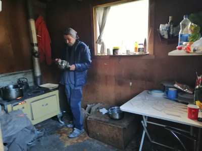 Por la mañana nos adentramos en el bosque y trabajamos durante 3 horas y volvemos a cenar, y después de descansar una hora, retomamos el resto de las 5 horas de trabajo de la tarde. Lo que hacemos es juntar trozos grandes y pequeños de ramas sobrantes de árboles cortados. Más tarde, dijeron que los quemaban en el invierno para destruirlos, pero estos montones de ramas son realmente enormes. El nombre de la persona con la que trabajaremos y nos alojaremos es Ricardo, él ha estado pescando con su familia en la ciudad de Puerto Nathales durante muchos años y ha migrado aquí debido a problemas financieros no resueltos a largo plazo con su familia, de hecho, satisface sus necesidades anuales utilizando las lanchas que van a Capilla Mármol durante la temporada turística. Durante este período de pandemia, comenzó el negocio forestal para brindar apoyo financiero, pero como he presenciado muchas veces, tuvo dificultades incluso para usar la máquina cortadora de madera. Así que no era un trabajo para él, y no era un trabajo para él, y no era un trabajo para él. Desayunaba con el mate, almorzaba con unos pedazos de pan y cena, si la había, y cenaba con el mate para cerrar el día. Creo que puedo decir claramente que era adicto a la serie, a su mate y a su gato.